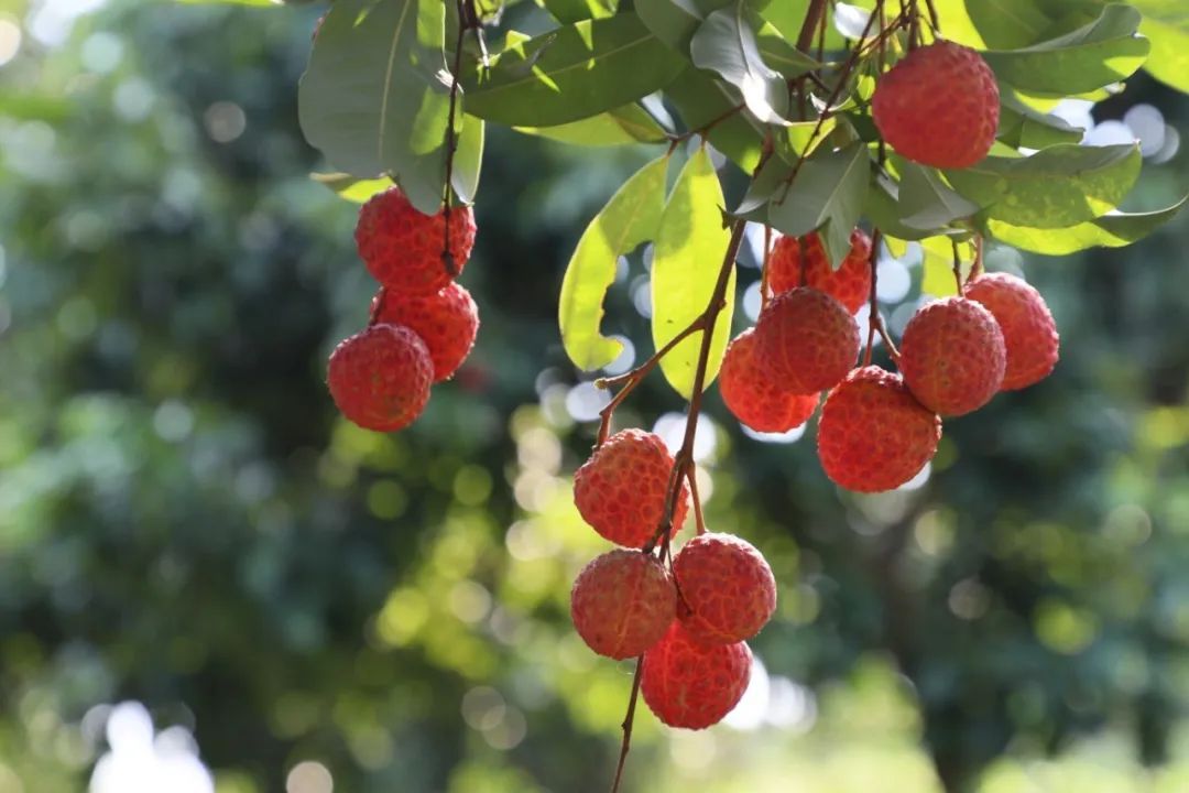 步入核心产区,荔枝树整齐排列在四周山坡上,拾阶而上,仿佛置身于墨绿色山水画中。阳光穿透层叠的叶隙,在鲜亮的果皮上跳跃、闪烁,折射出诱人的光泽。
