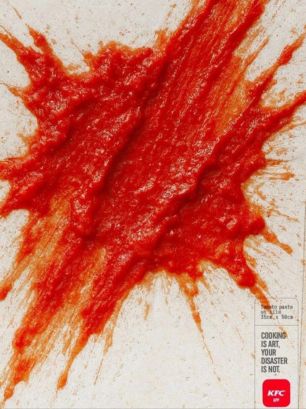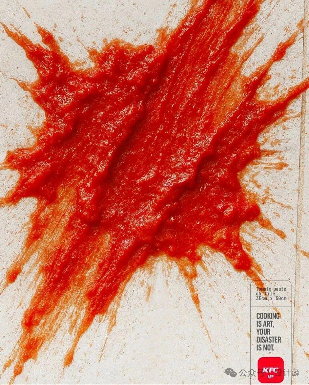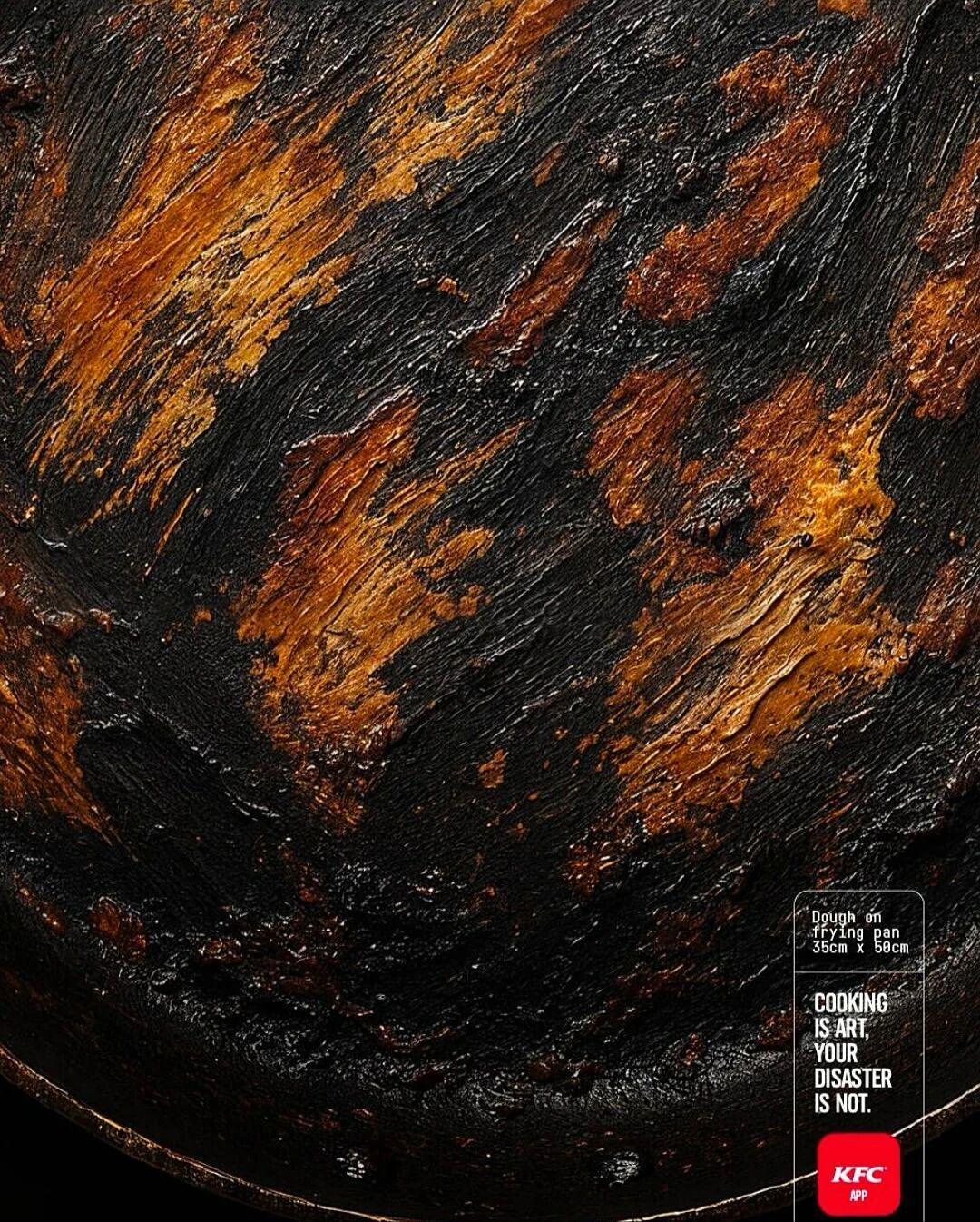 右下角的文案“烹饪是艺术,你的灾难不是(COOKING IS ART, YOUR DISASTER IS NOT.)”,紧接着是KFC App的标志。