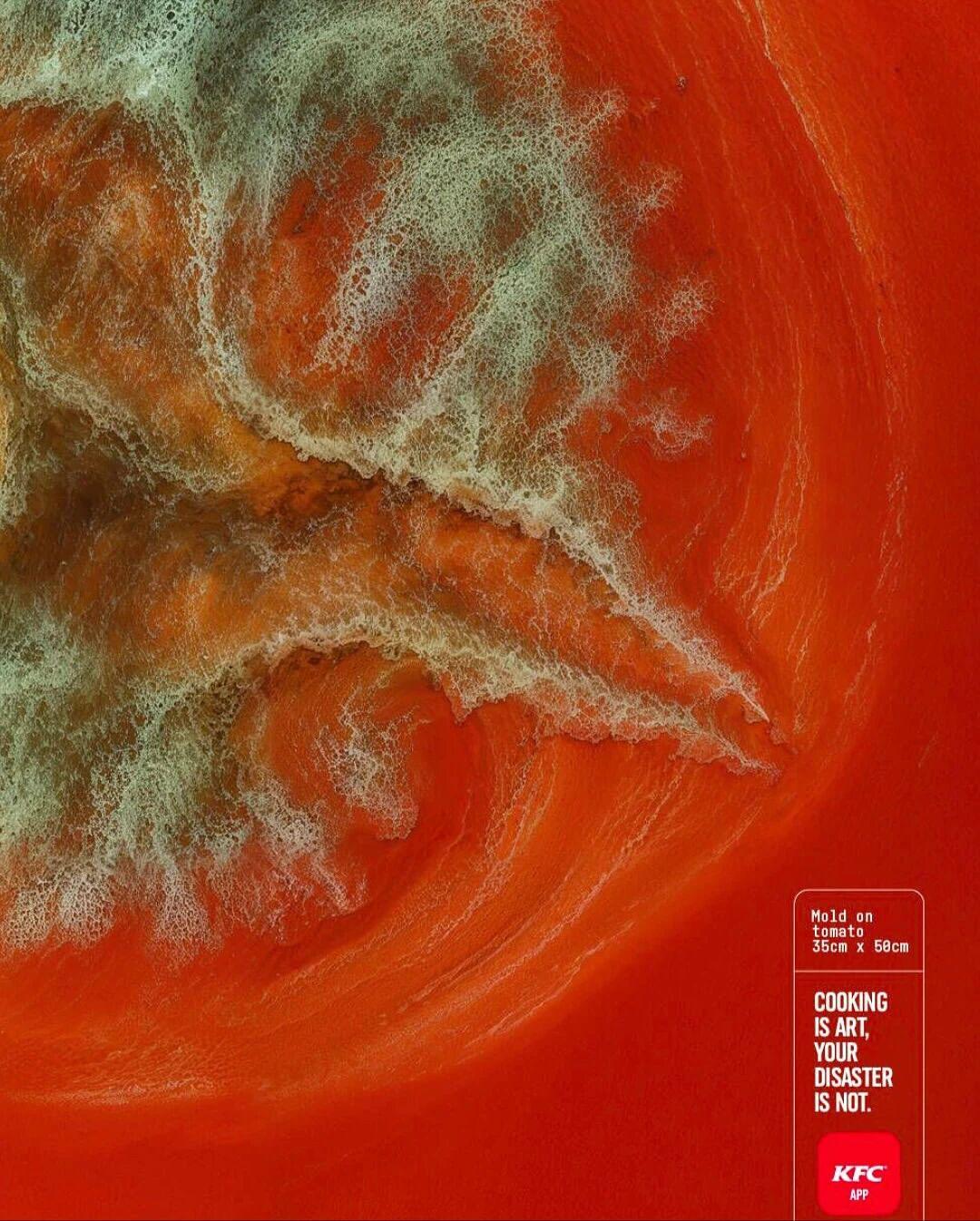 广告把常见的厨房“灾难”(撒了的面粉、烧焦的锅底、溅出的番茄酱和发霉的番茄)从日常的、令人沮丧的视角,提升到了宏观的、艺术的视角: